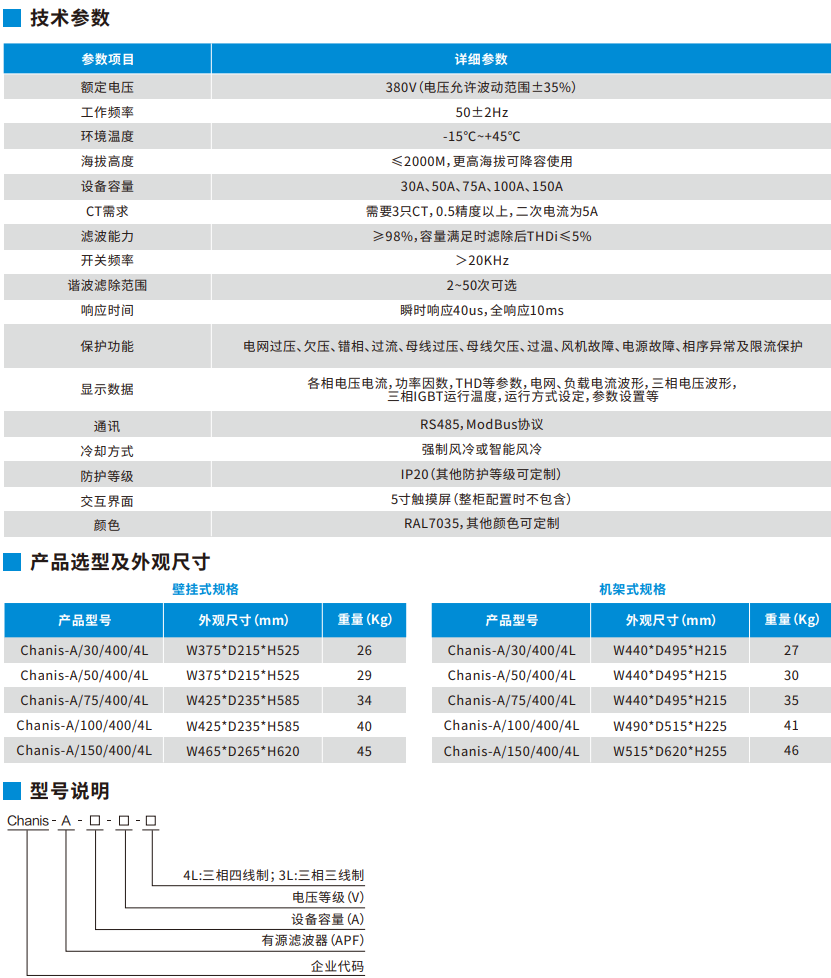 Chanis-A系列有源電?濾波器是基于IGBT功率變化器的?于動態濾除諧波、動態補償?功的電?電?裝置。系列有源電?濾波器實時 監測電?中的各次諧波和?功功率,并進?動態跟蹤補償,因此能夠對幅值和頻率都變化的諧波和變化的?功進?補償。系列有源電?濾波 器克服了傳統?源濾波器的濾波效果差、容易發?諧振、只能補償固定次諧波等缺點,對各種快速瞬變的沖擊性負荷均能起到良好的濾波和補償 效果。 Chanis-A系列有源電?濾波器采?閉環控制?式,并結合獨創的?適應控制算法,使其在滿載和輕載下均能達到很好的諧波性能;系列 有源電?濾波器采?電流平均值控制?式并結合LCL拓撲結構,克服了傳統的滿環電流控制由于開關頻率變化所帶來的輸出頻率范圍寬、濾波 較困難、?頻諧波會?擾電?等缺點。