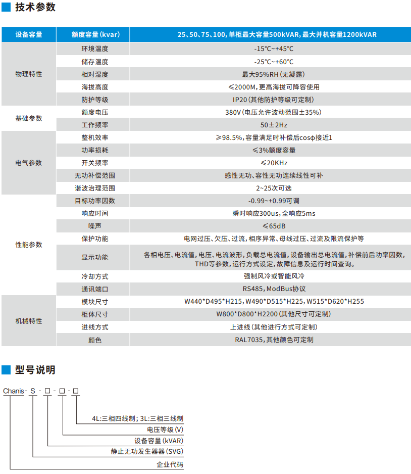 Chanis-S靜??功發?器(SVG)系列突破了傳統?功補償的理念,即不使?電容器組合電抗器產??功功率,?采?電?電?器件IGBT功 率管來搭建整流和逆變電路,組成,可對負荷實現雙向補償和連續性調節,實現功率因數全程接近。