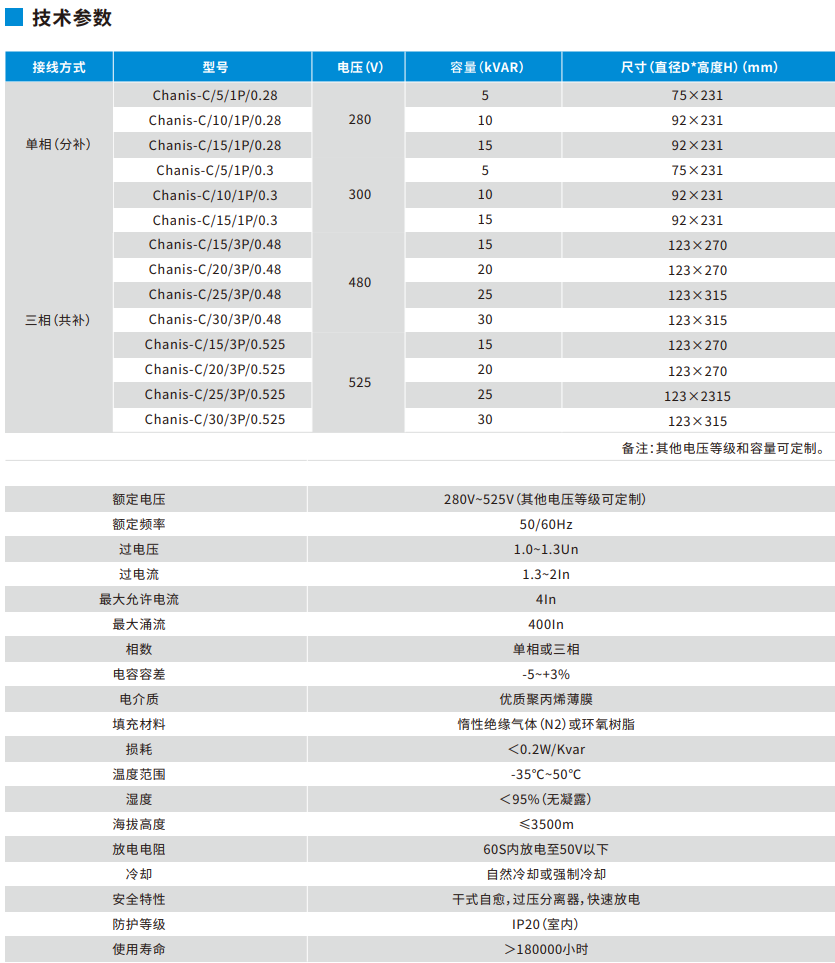 圓柱型低壓?愈式Chanis-C防爆電容器,是為低壓配電系統?功功率補償?設計的新型集成式電容器,分為單相,三相??煞謩e應?于單相 分補和三相共補系統中,適?于各類?業及??項?的低壓配電系統中。