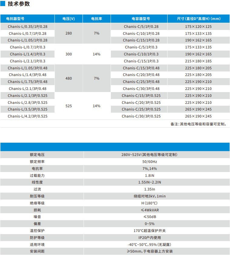 Chanis-L串聯(lián)電抗器?于低壓配電系統(tǒng)中,與并聯(lián)電容器組串聯(lián),調(diào)諧?某? 諧振頻率,吸收電?中相應(yīng)頻率的諧波電流。電抗器為?式結(jié)構(gòu),采?優(yōu)質(zhì)硅鋼?、 耐?溫漆包線繞制,優(yōu)質(zhì)樹脂繞注?成,具有過載能?強(qiáng)、損耗?、溫升低、噪?? 等特點(diǎn)。?于3、5、7、11、13次諧波負(fù)載的?功補(bǔ)償及調(diào)諧濾波作?。